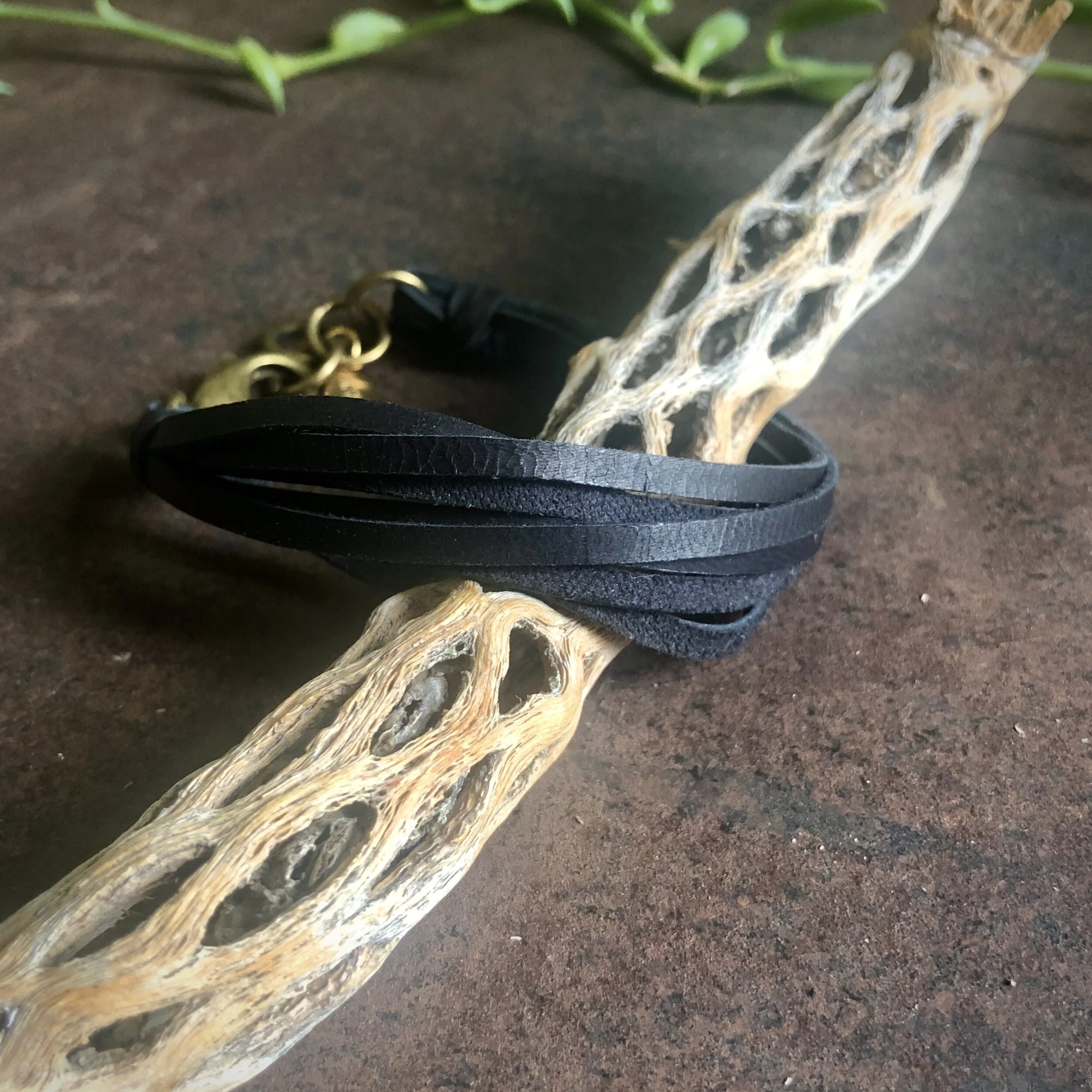 Multi Strand Leather Bracelet - Black / Brass